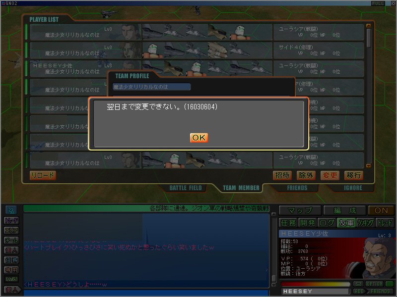 ん……。何かな…………?知らなかったの!チーム名変更が、1日1回きりの魔法だなんて知らなかったの!!リリカルなのはだけに。ハゲドリル大尉なんて、人事の様に「ひっさびさに笑い死ぬかと思ったくらい笑いましたw」なんて言ってるし!いや、実際人事なんですけどね。その下の、私の「どうしよ……w」って発言が、今見ても切ないです。