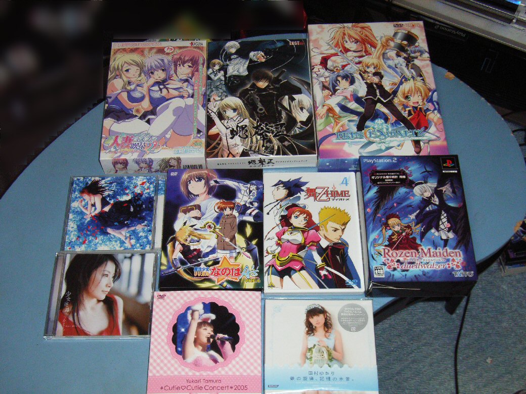 やってきました、恒例(恒例?)の駄目写真公開。今月主に買った物はこんな感じ。田村ゆかりのライブDVDは今月買った訳じゃないんですけど、アルバムだけ写すのも寂しかったので置いてみました。上段左から、人妻コスプレ喫茶2、蝿声の王、プリンセスワルツ、栗林みな実セカンドアルバム、なのはA'sDVD4巻、舞-乙HiMEDVD4巻、PS2版ローゼンメイデン、三郷あきニューシングル、田村ゆかりライブDVD、田村ゆかりニューアルバム、と、並んでおります。