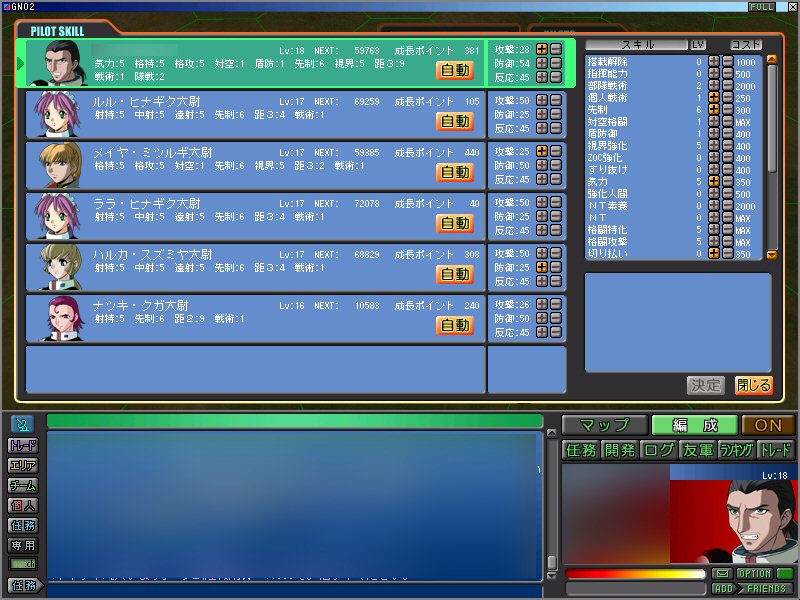 まずはNT素養から。これは、取ったからなんだ、というスキルではなく、NTに覚醒してから初めて効果が出るスキルな上に必要な成長ポイントが多いので、一番の悩み所。場合によっては射撃の先制値が壁を上回る危険性を孕んでいる恐ろしいスキルなので、どうしても取得に慎重になってしまいます。一晩で運が良ければ4くらいまで上がる可能性のある時期、つまり、次の作戦準備期間に取るのが一番いいかな、と思っていますが、果たしてどうか。最悪、専用ガンダムEz8までには覚醒してもらわないと困るので、恐らくはそのタイミングで取得すると思います。