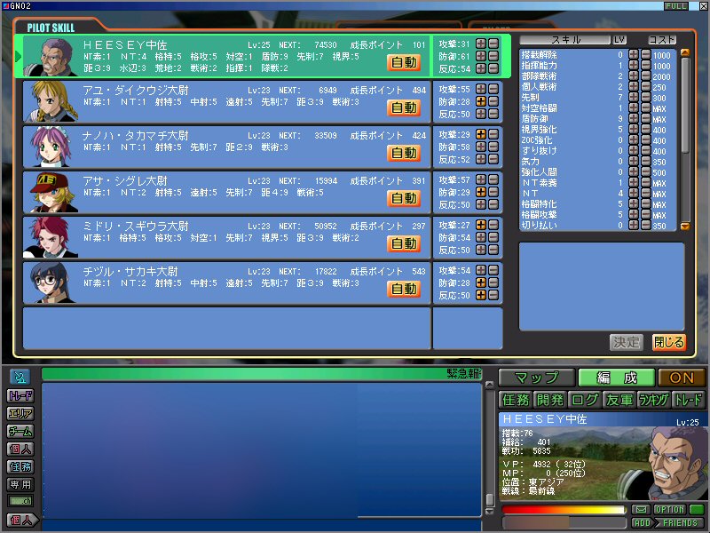 後は慌てて対空格闘を取ったくらいで、必要なスキルを上乗せしていきつつ、ステ向上に努めるくらいでしょうか。問題は、その必要なスキルを取る時期です。ざっと見回して今後必要なスキルというと、NT素養、盾、荒地、水辺、隊長のみ指揮。こんなところでしょうか。