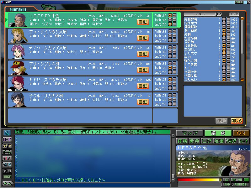 そんな訳で現在のステです。見ての通り、現在のレギュラーメンバーはNT素養を取り、NT開花待ち状態。この先、隊長以外は反応と相談しながら地形スキルを取って行くだけ状態ともいいます。隊長は水辺だけ早めにMAXにする予定。といっても、ガンダムEz8がロールアウトする時にMAXあればいいので、ガンダムEz8が開発投票に上ってからでも問題ないかな。後、最後の大仕事である指揮が残っていますが、これはジムカスタムがロールアウトする頃にMAXあればいいかな、くらいで考えています。しかしながら、装甲強化型ジムが出たらちょっと考えていることがあるので、もうちょい早めに取得するかも。まぁ、被弾率との兼ね合い次第ですが。