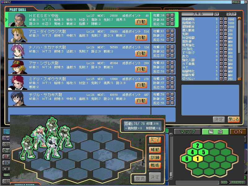 これが現在の編成とステ。作戦終了したので、なのはをベンチに戻して碧ちゃんのリハビリ編成となっています。碧ちゃんは最弱以外のエリートの低狙いからは20%〜40%という非常に危険な被弾率なんですけど、専用先行量産型ジム地上用の長距離ビーム・ライフルが余りに暴力的な威力で高狙いをしている為、突っ込んでくる低狙いはあっという間に無力化または撃墜されています。次の作戦開始までに、最低でもNT3になってくれないと非常に困った事になるんですが、果たしてどうなることやら。3距離射撃をするパイロットの反応値がズレているのは、行動順番を一定にする為。1ターン目、一番最初に動くのは隊長なんですが、その真後ろに千鶴が入ってくれないと困るので……。なのははこれから近距離射撃をMAXに持っていった後、防御や反応値を調整して、中距離射撃取得に乗り出す予定。6機編成に移行した時に、少しでもパンチ力がないと困りますし。隊長があの位置にいるのは、最強エリートの全力防御グフ・カスタムに確実に正対する為。隊長は未だに近狙いだけの指示で、部隊戦術で方向を正面に指定してやってる為、必ず正対してくれています。方向指示が出来る場合、壁は近狙いの方が楽でいいですね。