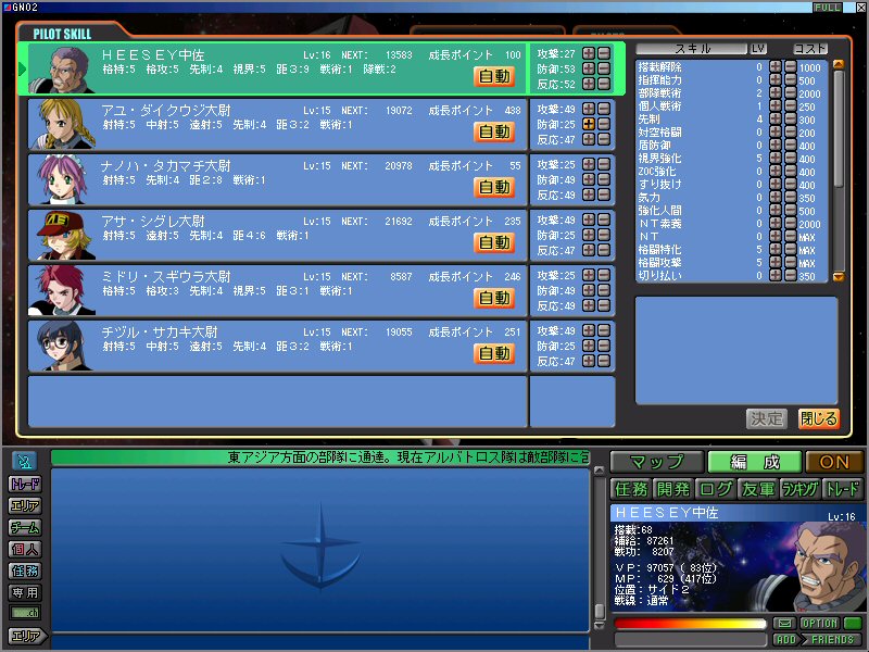 今日のGNO2すでに20日を超えていますが、まだまだ300編成で通常放置中。ジム陸戦用☆がロールアウトされる頃に前線に出す予定ですが、果たしてどうなるか。今クールは隊長、部下壁ともに気力にする予定なので、300編成でもエリートには負けないとは思いますが、やった事がないのでまだまだ未知数です。
