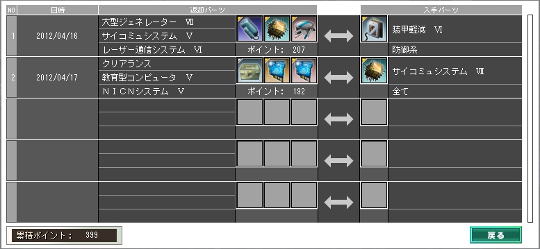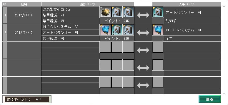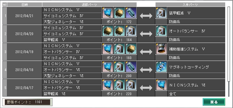 2012/04/17NICNⅤにオマケを付けて叩き返したら、Ⅵになって戻ってきました。また明日、叩き返します。ヒーセはパーツに大して不満がない分、やっぱり目標絞った方が良さそうかなぁ。装甲系、盾系は総じて交換ポイントが低いので、合計ポイント200近くかければ、装甲軽減かオートバランサーになる確率が非常に高い気がします。